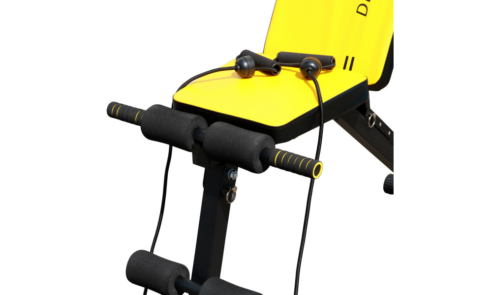 Скамья снабжена мягкими валиками, которые позволяют избежать травм во время выполнения упражнений. Скамья имеет складную конструкцию с фиксацией собранного положения с помощью 2 штырей с кольцом.